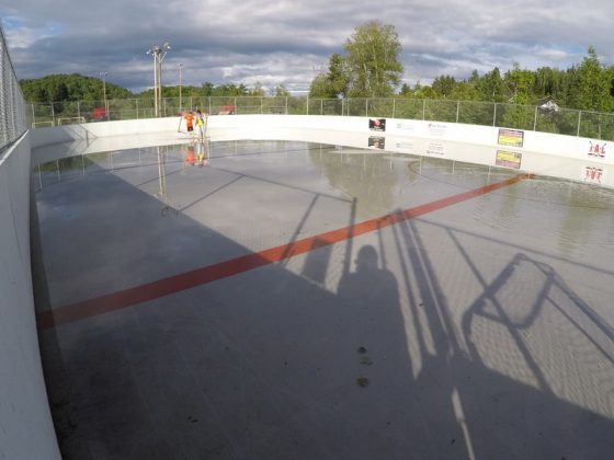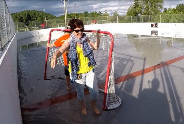 L’orage de la veille (accompagné de grêle, rappelons-nous) a laissé beaucoup d’eau sur la patinoire du parc Legault. Une accumulation de plusieurs centimètres qui montre comment les bandes sont étanches, une qualité utile quand vient le temps d’arroser et de faire la glace, l’hiver venu, mais qui devient un handicap lorsqu’il pleut.