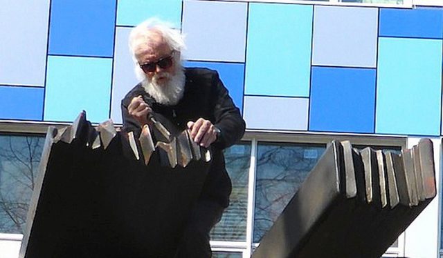 Donc, Marcel et moi aidé par une équipe du contracteur, nous avions défait la sculpture en 4 morceaux pour que l’entrepreneur puisse faire ses travaux et là nous étions à nouveau sur les lieux, afin de remettre en place la sculpture de façon définitive en ce matin ensoleillé de septembre 2016.