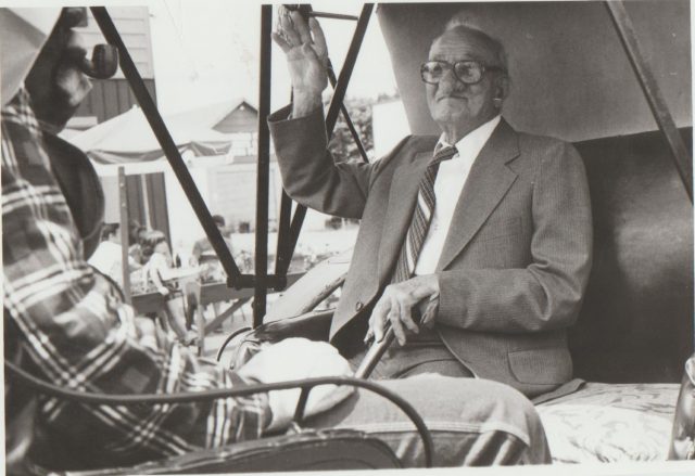 Léonidas Dufresne, l’un des fondateurs du village de Val-David, approchait de ses 100 ans lorsqu’il a participé à cette parade de la Saint-Jean au cours des années quatre-vingt. Il a été le premier maire de Val-David en 1921 (la municipalité s’appelait alors Saint-Jean-Baptiste-de-Bélisle. Il a ouvert le magasin général Léonidas-Dufresne en janvier 1929. Avec cette photo des archives de la Société d’histoire et du patrimoine de Val-David, vers 1930, on conclut que la façade en brique du magasin est toujours debout devant l’édifice qui est situé directement voisin du marché Metro. Plus de détails sur la magasin sur le site de la Société d’histoire.