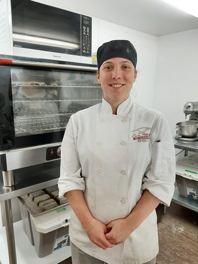 Myriam aime beaucoup les sports et le plein air. Elle rêvait de poursuivre des études en éducation physique, mais elle a suivi un tout autre parcours. C’est à l’École hôtelière des Laurentides qu’elle a fait des études en cuisine d’établissement. Peut-être parce que son père est pâtissier à la boulangerie Boivin, ses parents l’ont encouragée dans cette voie. C’est peut-être ce qui explique que Myriam a aussi suivi des cours en pâtisserie et en boulangerie. Après trois années d’études, c’est bien outillée que Myriam, fière de ses trois diplômes, parfait ses techniques en pâtisserie française dans un établissement haut de gamme à Laval… Myriam est fin prête pour le marché du travail! C’est à la boulangerie le Breadshop de Morin-Heights que je l’ai retrouvée par hasard, toujours souriante, mettant ses connaissances en pratique pour confectionner des viennoiseries. Et aujourd’hui, c’est ici, à Val-David, qu’elle met son talent au service de la boulangerie La Mie Richard. Elle adore toujours son métier! De plus, elle a la chance de travailler dans les Laurentides, car la ville… très peu pour elle, alors que respirer l’air frais après une journée de travail, c’est sa récompense.