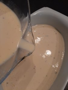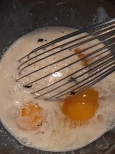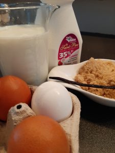 Dans un bol, mélanger 3 oeufs, 60 gr de cassonade, 1 gousse de vanille grattée ou 1 cuiilère à thé de vanille, 250 ml de lait et 250 ml de crème 35%.