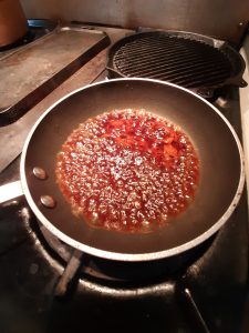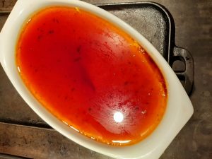 Sur le caramel verser 150 ml d’eau bouillante et une pincée de sel et le réduire de moitié. Tempérer le caramel liquide et le verser sur la crème prise.