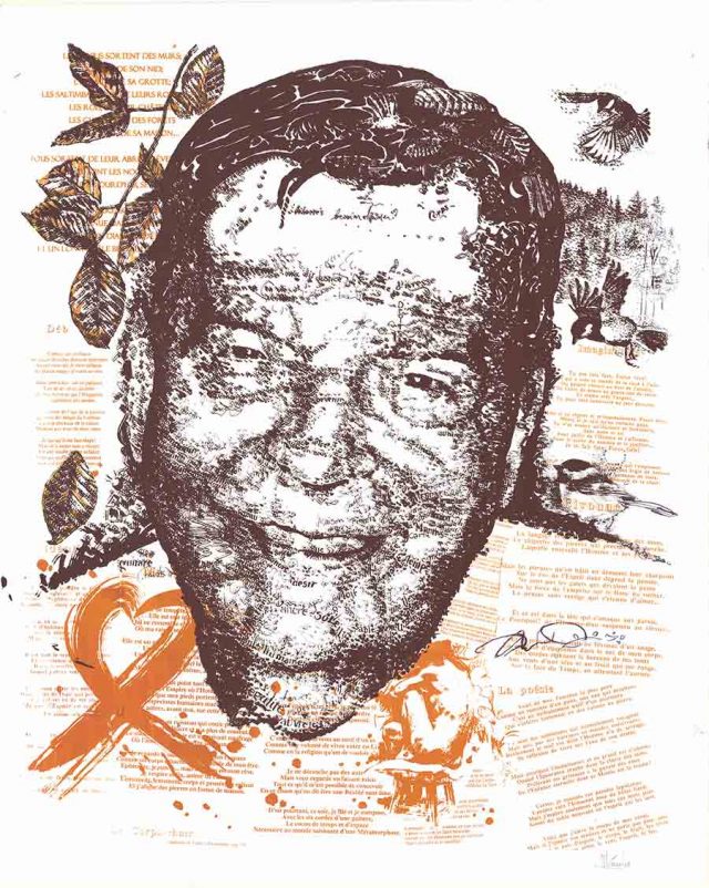 Je tiens aussi à remercier particulièrement Normand Ménard pour la magnifique sérigraphie qu’il a faite du poète. Sur les impressions de petit format, on ne peut pas voir que toutes les ombres sont en fait des mots tirés des poèmes. Seule la sérigraphie originale permet d’apprécier tous ces détails. C’est une œuvre d’art absolument magnifique dont Normand n’aura tiré que quelques exemplaires.