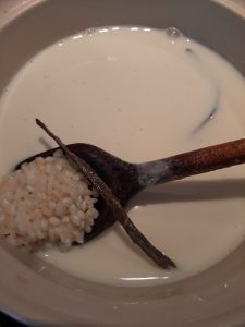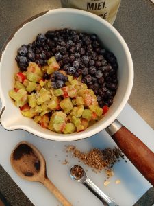 Dans une casserole, mélangez 500 ml de bleuets, 750 ml de rhubarbe. J’ai utilisé les fruits achetés au Marché d’été que j’ai mis sous vide et congelés. Ajoutez 1⁄2 cuillère à thé de cardamome écrasée (Épices du cru) et 180 ml de miel (la Chaumière Fleur Soleil, Val-David).