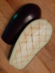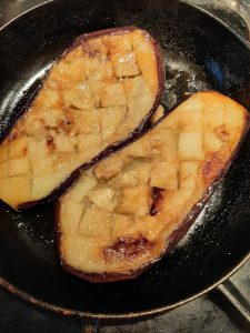 Couper une aubergine en deux dans le sens de la longueur. À l’aide d’un couteau, faire des entailles profondes dans la chair. Verser de l’huile d’olive (généreusement) sur chaque moitié. Saler et poivrer. Déposer les aubergines dans une poêle froide côté chair vers le bas. Cuire à feu doux jusqu’aux trois quarts de cuisson pour obtenir une belle coloration. Retourner les aubergines côté peau et verser un filet d’eau dans la poêle pour terminer la cuisson à la vapeur.