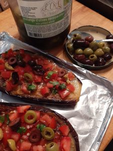 Pendant ce temps, préparer un concassé de tomates fraîches avec de l’ail, de l’huile d’olive et des olives biologiques de l’Or d’Italie, du basilic frais et de la fleur de sel. Garnir les aubergines de ce mélange et terminer la cuisson au four à 350 F environ 12 minutes pour tiédir les tomates.
