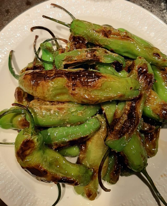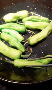 Je lave et je sèche les shishito. Je les fais sauter dans un poêlon bien chaud couvert d’une mince couche d’huile d’olive.
