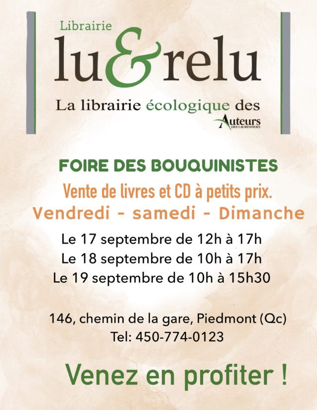 L’Association des auteurs des Laurentides annonce sa Foire des Bouquinistes à la Gare de Piedmont les 17 – 18 – 19 septembre.