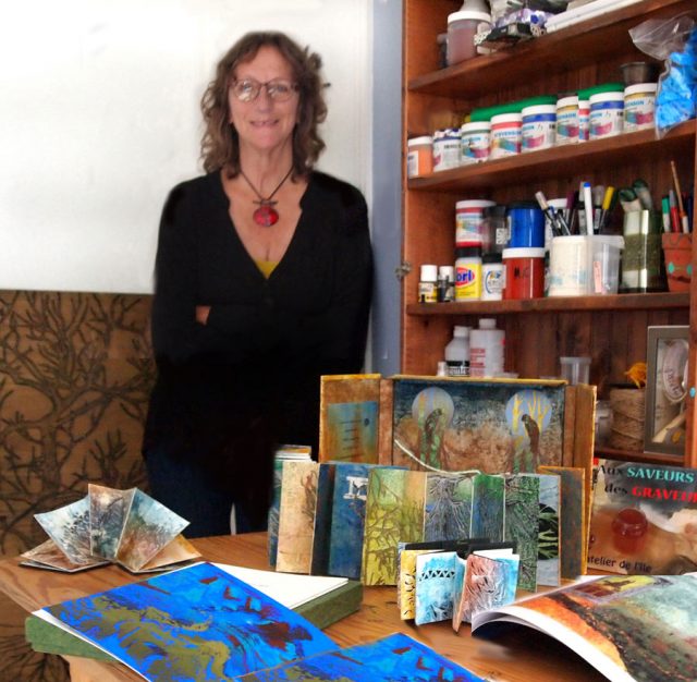 Après de nombreux déménagements de Sainte-Agathe jusqu’en Floride et des voyages avec des membres de l’Atelier de l’île ou encore en Europe avec son conjoint et ami Gaëtan, Michèle est revenue l’an dernier, une troisième fois et pour de bon, à cette maison si pleine de souvenirs au bord du lac Campeau. Elle réintègre ainsi Val-David pour vivre et travailler avec d’autres artistes ou dans son atelier, heureuse de revivre là où elle habita avec ses parents et nombreux frères et sœurs, là où elle éleva elle-même ses enfants il y a plus de vingt ans. Plus sûre d’elle et plus sereine, Michèle s’apprête à créer d’autres gravures, de nouveaux livres d’artiste ou des œuvres encore inconnues, comme si la petite maison bleue avait de tout temps attendu son retour…
