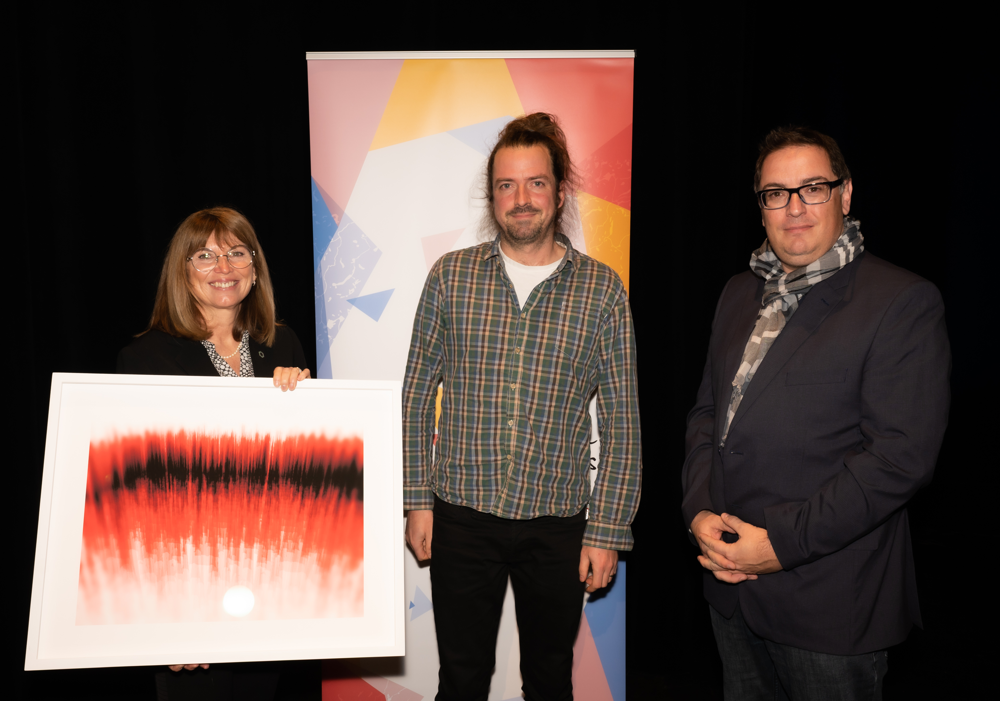 Prix Art-Éducation : Alexis Vaillancourt, enseignant Cégep de Saint-Jérôme (Cégep lauréat); Alexandre Gélinas. Œuvre de Sébastien Pitt