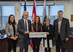 Cet événement a eu lieu en présence de (de g. à dr.) : Marie-Hélène Gaudreau; Stéphane Lauzon; la ministre responsable de l’Habitation et députée de Bertrand, France-Élaine Duranceau; la mairesse de Val-Morin, Mme Donna Salvati; le député d’Argenteuil-La Petite-Nation et président des Habitations La Capucine, Pierre Asselin.