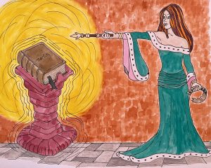 Morrigane pointe le sceptre vers le grand livre, un effet de fumée et de lumière éblouissante se produit.