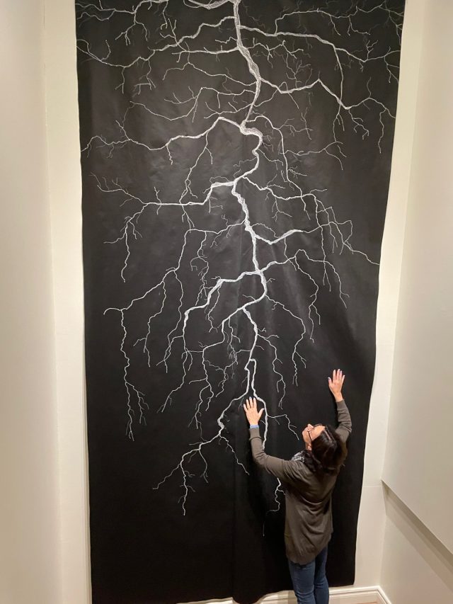 Originaire d’Ukraine, Eugenia Reznik dessine, brode, imprime des racines sans fin, fasciculées, pivotantes, traçantes qui voyagent, courent, migrent et émigrent sur les murs, immenses, si profondes qu’elles vont du plancher au plafond, pointant jusqu’au ciel. Imaginez l’étendue de la canopée!
