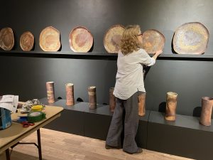 Robin Hutchinson passe de l’atelier à la forêt pour œuvrer. La céramiste prend soin de nous montrer la terre sous nos pieds à même l’argile d’ici qu’elle façonne tandis qu’elle nous projette dans le cosmos avec ses assiettes astrales, ses myriades de bols; elle fait basculer l’horizon de haut en bas. S’enfoncer au sein de la terre signifie aussi s’élever vers le soleil.