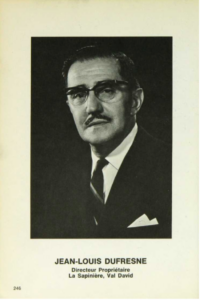 Jean-Louis Dufresne, né en 1913, est un pur produit val-davidois et un des «grands» de notre histoire. Au cours de sa vie, il parvient à atteindre les sommets de la renommée laurentienne, québécoise, canadienne, américaine et même mondiale. Dans le domaine de l’hôtellerie et de la gastronomie, l’histoire de Val-David n’offre aucun autre exemple d’une telle réussite.