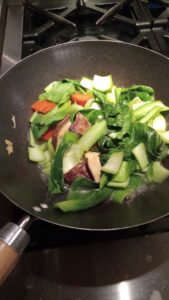 - Ajouter les légumes de votre choix et laisser mijoter 3 minutes, ou jusqu’à ce qu’ils soient cuits mais croquants. (Parfois, je saute les shiitakes dans l’huile de tournesol pour développer leur saveur noisette.)