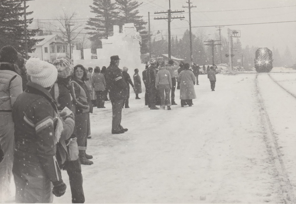L'arrivée du train durant l'hiver à Val-David. Année inconnue.